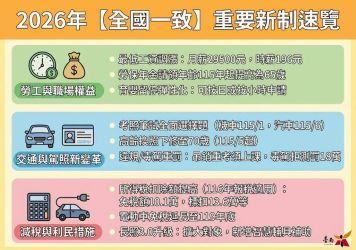 【記者賴建邦/台南報導】迎接嶄新的115年(2026年),台南市政府貼心為市民朋友整理即將上路的新制措施,其中不僅有全國一致實施的重要制度,更有多項「台南限定」的加碼與創新作為,直接回應市民需求、照顧在地生活。市府邀請市民朋友提早掌握重點,讓新制度成為新年度的最佳助力。【台南市獨有的新制度】在社會福利方面,台南市自115年起將重陽敬老金提高至新台幣1,500元,持續照顧長者生活。115年起市民申請海葬補助,擴大為全年度皆可申請,補助每位亡者新台幣1萬5,000元,協助辦理殮葬及租用船舶事宜。在原民福利上,市府針對設籍本市且具原住民身分之市民,提供分級租金補貼,並同步提供意外失能及身故保險保障,強化居住與生活安全支持。在環保與管理措施方面,115年7月1日起,出廠滿一定年限之柴油大客貨車及燃油機車進入南部科學園區台南園區及樹谷園區空氣品質維護區前,須具備合格檢驗或有效期限內之自主管理標章。在公共安全領域,台南市政府訂定「建築物外牆安全巡查及通報執行計畫」,加強老舊建築及高風險外牆之管理作業,保障市民公共安全。在觀光旅遊方面,南市跟日本友誼市合作推動雙方景點門票互惠措施,自明(115)年1月1日起,市民持市民卡或國民身分證,造訪日本山口縣、山形市、日光市、水上町、宇土市、別府市、宇佐市等7個城市所公告的景點,即可享有專屬台南市民的門票優惠,與此同時,這7個日本城市市民持證造訪台南市公告景點時,亦能享有比照本市市民的優待。(詳情參閱→ https://reurl.cc/7bbe8d )台南公共自行車YouBike 2.0新制上路,市府為保障YouBiker權益,騎乘時更安全及更安心,自 明(115)年1月1日起,於台南若未投保「公共自行車傷害險」,將無法租借YouBike 2.0/2.0E,且本制度適用嘉義縣市、高雄市及屏東縣。 【全國一致實施之115年新制措施】除本市加碼政策外,多項全國性新制亦將於115年起上路,與市民生活密切相關。在勞工政策方面,最低工資調升至月薪新台幣29,500元、時薪196元,育嬰留職停薪津貼可按日申請並提高至八成薪資補貼,家庭照顧假亦可採小時為單位請假,協助勞工兼顧工作與家庭。財稅方面,電動汽機車免徵使用牌照稅與貨物稅優惠持續延長;所得稅免稅額、扣除額與基本生活費同步調高,有助於減輕納稅負擔。另自115年起,四大超商多媒體事務機將不再提供以健保卡查繳地方稅服務,提醒市民改以其他管道辦理。交通制度亦有多項調整,包括汽、機車考照筆試全面改為選擇題,高齡換照年齡下修至70歲,並強化路考內容及道安講習規範,以提升整體交通安全。115年1月起年滿70歲自願繳回駕照提供TPASS乘車回饋,每月回饋金上限1500元,補助期間2年。在環保與管理措施方面,115年7月1日起,針對裝修廢棄物推動電子聯單制度,全面掌握廢棄物流向。在衛生醫療與環保政策方面,包含胃幽門螺旋桿菌檢測補助、再生醫療法施行、食品安全監測制度擴大,以及空氣品質維護區管制措施,皆將全面推動,守護全民健康與環境品質。台南市政府表示,115年新制涵蓋層面廣泛,市民可依自身需求多加運用。市府將持續透過官網、新聞發布及社群管道提供最新資訊,協助市民順利接軌新制度,共同迎向更安全、幸福的台南。
