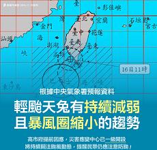 【記者林秀雲/高雄報導】天兔颱風逐步接近,高雄市政府(15)日上午9時將災害應變中心由昨晚擴大三級進駐提升為一級開設因應,市府團隊全力投入防災、加強相關防颱整備工作。根據中央氣象署最新預報,天兔颱風暴風範圍不大,且持續減弱當中,評估對高雄陸地影響減低,但仍構成威脅,市府呼籲市民朋友不可輕忽,持續關注颱風最新動態。高市府人事處已發布桃源區梅山里、拉芙蘭里及復興里,因道路有持續性落石,桃源區公所考量居民及師生安全,宣布(15)日下午3里停止上班停止上課。市府表示,因應天兔颱風來襲,市府嚴加警戒、全面提升防範,已完成抽水機具整備、排水溝渠清淤、派員建築工地巡查等各項颱風應變作為,也提醒農、漁民朋友儘早因應,做好田間防水、檢修固定相關設備,務必留意最新天氣資訊,以減少災害損失;另也請廣告業者加強固著或提前拆除廣告帆布,避免掉落。依據中央氣象署最新預報資料,天兔颱風有持續減弱且暴風圈縮小的趨勢,評估對高雄陸地影響程度降低,市府提醒民眾仍應注意防颱準備、切勿輕忽,隨時掌握颱風動態,大樓做好防颱準備,必要時並備妥沙包、防水閘門等阻水應變設施,也呼籲山區及沿海民眾提高警覺,警報期間勿前往山區或海邊水域,如有相關災情請立即撥打119或1999通報。