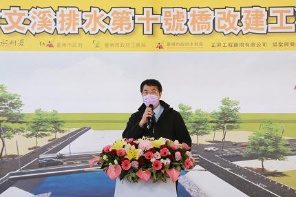 【記者陳姿伊/台南報導】台南市政府為解決曾文溪排水第十號橋因通洪斷面不足而經常大雨致災的問題,積極向中央爭取補助經費1億1,380萬元及市府負擔6,820萬元,共計投入總經費約1.82億元辦理橋梁改建工程,並於今(28)日由市長黃偉哲主持開工動土典禮,正式啟動曾文溪排水整治工作,工程預計於111年汛期前完工,可望有效改善安南區十二佃等地區淹水問題。台南市長黃偉哲表示,感謝水利署補助此工程經費,過去安中路常被調侃為「安中河」,大雨淹水造成居民生活上非常大的不便及財產的損失,希望未來藉由抬高橋面增加通水斷面,能夠有效增加曾文溪排洪速度,改善安中路淹水狀況,洗刷安中河的汙名,並期盼提前努力完工,讓居民的生活早日享有更好的道路通行及排水品質。台南市政府工務局指出,多年來曾文溪排水系統每逢豪大雨,容易發生排水不及導致淹水災情,附近居民苦不堪言;近年來中央單位積極辦理曾文溪排水整治工程,市府亦配合辦理沿線橋梁改建工程。曾文溪排水第十號橋改建工程投入總經費約1.82億元,其中包含工程費1.42億元及用地費4,000萬元,經濟部水利署核定補助經費9,520萬元,及委託代辦堤防、防汛道路1,860萬元,工程內容除橋梁主體改建外,也包含橋梁引道及四邊防汛道路的銜接。曾文溪排水第十號橋現況為橋長約40公尺的雙孔箱涵橋,改建後為橋長58.4公尺的兩跨I型鋼梁橋,且梁底高程將配合提升,以符合「台南地區曾文溪排水治理計畫」要求;橋梁改善完成後,將可提升曾文溪排水防洪能力,再配合排水整治改善,預期將可解決安南區十二佃等地區的淹水問題。今日動土典禮,包括水利署主秘黃宏莆、第六河川局長陳建成、工務局長蘇金安、安南區長葉誌明及市議員郭清華、王錦德、Ingay Tali 穎艾達利、黃麗招、陳怡珍與在地里長、鄉親等到場共襄盛舉。