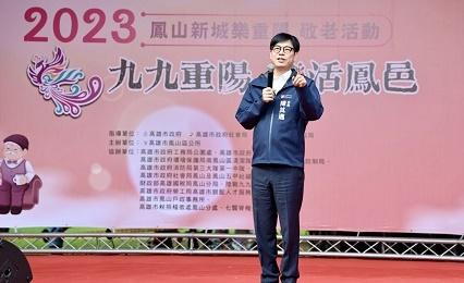 【記者林秀雲/高雄報導】重陽節將至,高雄市長陳其邁(14)日偕同立委許智傑及在地議員至衛武營都會公園出席「九九重陽 樂活鳳邑」重陽敬老活動,親切問候關心長輩、抽獎摸彩,現場氣氛熱絡。陳其邁提到,目前高雄65歲以上長輩人口已達51萬人,市府會持續強化對長輩的照顧,提高重陽敬老金、廣設C級巷弄站、社區關懷據點、日照中心,提供長輩適合的體適能設施等,落實在地安老政策,讓所有長輩活得健康、快樂又年輕。陳其邁表示,市府積極拚經濟、財政穩定,今(112)年將65歲至79歲的重陽敬老金提高至1500元,讓長輩們有更多零用錢可以運用。在長者照護部分,高雄C級巷弄站539個,社區關懷據點目前有527個,年底將達到545個,在地日照中心亦達112個,讓社區內長輩、鄰居可以相互作伴、照顧,以落實在地安養、安老。陳其邁指出,高雄人口高齡化,市府全力照護長輩,他回憶COVID-19疫情期間,染疫後65歲以上長輩服用抗病毒藥物者高達95%,且醫療院所皆會親自致電關心病況,讓長輩安心。另外,運動中心全高雄有14座,在鳳山就有專門針對長輩所提供的運動教學跟指導,讓長輩透過合適的運動設施來預防肌少症,以維持身體康健。