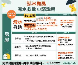 【記者林秀雲/高雄報導】凱米颱風橫掃全台,對中南部地區災情造成嚴重影響,高雄市多處傳出淹水災情,為減輕颱風對民眾家庭財產損失的衝擊,今(26)市長陳其邁在總統賴清德至美濃視察災情時向中央爭取,賴清德總統現場宣佈,針對住戶淹水50公分以上住戶,由中央加發每戶2萬元,連同高雄市府1.5萬元補助,共計每戶慰助金3.5萬元;淹水50公分以上住戶,若擁有中低收入戶身分,中央再加發1萬元,共計4.5萬元。而對於淹水低於 50公分的住戶,高雄市社會局指出,市府也加碼每戶5千元的補助金。另外,民眾的住宅有淹水樓層部分或毀損面積超過50%,高雄市稅捐處表示可一年免繳房屋稅;房屋毀損面積30%到50%之間,一年僅需繳50%房屋稅。市府表示,將全力協助民眾重建家園,恢復正常生活。社會局指出,依據「高雄市災害救助金核發辦法」規定,因颱風致住屋淹水達50公分以上之有居住事實現住戶,每戶發放1.5萬元慰助金,另市府向中央爭取加發住戶淹水慰助每戶2-3萬元,一般戶可領慰助金3.5萬元(中央2萬+市府1.5萬),低收入、中低收入經濟弱勢户可領慰助金4.5萬元(中央3萬+市府1.5萬)。此外,為減輕民眾財產損失衝擊,房屋淹水50公分以下,市府加碼補助每戶5000元;泡水車部分,依據維修的費用,汽車慰助金最高補助2萬元,機車慰助金最高補助2000元。高雄市府提醒,不論淹水是否達到50公分法規標準,以及泡水車主,從即日都可以到淹水區域的區公所填寫申請書,並請檢具相關證明:〈一〉淹水住戶請檢具例如淹水照片、行車紀錄、監視器紀錄、或其他足資證明之資料等。〈二〉泡水車輛請檢具例如維修收據或證明、或其他足資證明之資料等,以利加快勘查、審核速度,早日領取核撥款項。