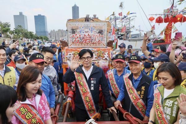 【記者陳姿伊/高雄報導】全臺3月瘋媽祖,高雄也迎接四年一度民俗盛事,四年一科的「林園鳳芸宮媽祖海巡」展開平安遶境巡香之旅,(11)日傍晚聖駕返抵高雄港,市長陳其邁前往接駕扶轎,他形容天上聖母可比宗教界的泰勒絲,深受信徒敬重愛戴,也祈求媽祖神威顯赫,庇佑高雄平安順利、四時無災,國泰民安、風調雨順。陳其邁表示,媽祖婆在臺灣神明界中深受敬重、信徒眾多,也是討海人、漁民朋友共同的寄望,林園鳳芸宮四年一科的海上巡香,更是高雄無形文化資產,他4年前及今年都特地前來參與,明晚海巡媽將回鑾安座,歡迎大家到林園迎接聖駕回宮。他提到,近年極端氣候益加嚴重,除了做好防災準備工作,也祈求媽祖神威顯赫,庇佑高雄平安順利、四時無災,國泰民安、風調雨順。天上聖母是臺灣民間信仰具代表性的神祇,市定民俗、四年一科的「林園鳳芸宮媽祖海巡」,是高雄市重要無形的文化資產,也是南臺灣最大規模定期海上巡香民俗活動。今科4月10日自林園啟程,由20餘艘船隊護駕,繞行西南沿海,途經臺南安平會香及高雄沿海多處港口後,再至高雄流行音樂中心駐港,展現海洋城市獨特信仰魅力。林園媽祖完成海上巡境後返回,陳其邁市長於港區接駕、參與扶轎,與中央地方民意代表、來自全臺各地的宮廟代表,共同進行祝壽、祈福團拜儀式。現場特別邀請藝陣及文化展演團隊獻演,並發放限量平安壓轎金,春美歌劇團最後以《媽祖傳》戲曲匯演謝神。大批信徒齊聚爭睹海巡媽風采,恭迎聖駕回鑾駐港。海上迎神場面壯觀隆重,22艘海巡船隊規模浩蕩盛大,船隻張燈結綵、裝飾繽紛,高雄港邊熱鬧無比、氣氛熱烈,今科還邀請臺南祀典大天后宮及麥寮拱範宮等開山媽祖聯誼會與眾神來高雄作客。林園媽緊接著明(12)日在鼓山、鹽埕淨港遶境,媽祖鑾轎最後自高雄港啟駕回鑾鳳芸宮安座,並於林園區進行平安遶境,為市民祈福,保佑地方順遂平安。