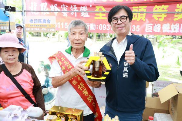 【記者林秀雲/高雄報導】2025高雄夏祭新鮮市主打精選在地優質農特產,其中大崗山野生龍眼林蜂蜜質地純正、香味濃郁、口感滑潤,堪稱「蜜中極品」。市長陳其邁(16)日出席第25屆「大崗山龍眼蜂蜜文化節」開幕,親自到場推薦,以行動表達支持。他致詞時談到養蜂的辛勞,強調「農會挺農民,市府挺農會」,並指出自己年年出席,從未間斷。今年龍眼蜂蜜迎來豐收,預估產量達2,000噸,他也頒發有「蜂蜜界奧斯卡」之稱的國產龍眼蜂蜜評鑑特等及頭等獎,肯定農友辛勤成果。陳其邁笑稱「好東西與好朋友分享」,並透露自己皮膚保養的秘訣就是蜂蜜,推薦大崗山龍眼蜜品質最優秀、最衛生、最安全。他指出,去年受極端氣候影響產量僅288噸,感謝農糧署、農業部開放天然災害救助,協助農民度過難關;今年花期氣候理想,蜜源充足,讓高雄龍眼蜂蜜展現「蜜中極品」的獨特風味。在熱鬧的倒數聲中,陳其邁與會嘉賓一同拉開紅色緞帶,象徵揭開優質蜂農產品序幕,並喝下沁涼蜂蜜水,豎起大拇指稱讚。隨後他也走訪攤位與民眾互動,並品嚐龍眼蜜霜淇淋,向大家推薦盛夏甜蜜好滋味。現場除展售蜂產品外,各式農特產也新鮮陳列,氣氛熱鬧。農業局表示,大崗山養蜂揚名全台,國產評鑑蜜品質絕佳聞名。今年市府與岡山、阿蓮、田寮、橋頭、杉林、大樹及內門等地農會共同參與,導入嚴謹評鑑制度進行安全及風味把關,經過兩階段程序遴選優質得獎者,再由獲得HACCP及ISO22000雙認證的食品加工廠分裝,品質與風味雙重保障,並透過「高雄首選電商平台」提供消費者選購。年年好評的「大崗山龍眼蜂蜜文化節」今、明兩日於大崗山如意公園甜蜜登場,除能購買國產蜂蜜外,周邊還有獨家蜂人秀演出、蜜境導覽、免費走讀月世界泥岩與石母乳洞穴生態輕旅行、寓教於樂的蜜蜂闖關遊戲、蜂潮市集及靜態展覽等,活動豐富,吸引民眾熱烈迴響。更多資訊可搜尋臉書「大崗山龍眼蜂蜜文化節」。