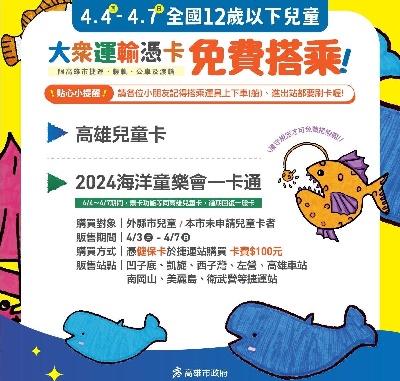 【記者洪崇欽/高雄報導】兒童節假期來高雄,絕對好玩好吃好優惠!高雄市政府持續致力於整合豐富多元藝文及觀光量能,讓高雄成為充滿歡笑的親子友善城市,今年兒童節,高市府特別規劃「2024海洋童樂會 高雄總動員」兒童節系列活動,於4月4日至4月7日四天連假期間推出吃喝玩樂「五大亮點」作為送給全國親子兒童節禮物,包括:紙風車劇團大型演出;高雄壽山動物園、國立科學工藝博物館及文化局所轄多個藝文館舍12歲以下免費入場;搭乘大眾運輸工具12歲以下免費;多間飯店親子入住可享優惠加碼商圈夜市券;知名百貨公司及主題遊樂園區推出多項優惠方案等。「兒童節,孩子最大!」高市府號召全國小朋友一同到高雄來留下難忘的回憶。高雄市長陳其邁表示,「今年兒童節,當然要在高雄過!」繼黃色小鴨游進冬日遊樂園後,今年4月4日至4月7日規劃兒童節期間的系列活動與優惠,要號召全台灣的家長帶著孩子來高雄度過四天連續假期,讓高雄搖身一變成為全台灣最大的遊樂園!連假期間高雄要用「五大亮點」歡迎全國大小朋友來到高雄,邀大家盡情享受這個屬於孩子的節日。市府也總動員體現高雄作為親子友善城市的熱情,透過多采多姿的藝術教育體驗及整合各項觀光優惠措施,歡迎大小朋友一起到高雄來場歡樂大冒險!文化局表示,「2024海洋童樂會‧高雄總動員」兒童節系列活動除了日前於社群釋出就受到熱烈討論的「海洋狂想曲 歡樂大冒險」即將於衛武營都會公園登場外,高雄市許多主題場館及文化局所轄多個藝文館舍也熱烈響應,包括:科工館、壽山動物園、駁二藝術特區、紅毛港文化園區、見城館、再見捌捌陸、鳳儀書院、旗山車站-糖鐵故事館等館所,同步推出12歲以下免費入場,更結合琳瑯滿目的體驗活動與期間限定優惠,歡迎各位爸媽一起來把四天行程排好排滿,共同迎接兒童節連假。「海洋狂想曲 歡樂大冒險」活動主場位於衛武營都會公園東側草坪,由市府與紙風車文教基金會共同為孩子打造一座臺灣原創樂園,以海洋為主題的7座超大型充氣裝置以及戲劇體驗,帶來全世界最大的小丑魚、近20公尺長的無敵好玩大王烏賊、40場全時段舞台表演、15項親子互動體驗、近百攤熱門美食,以及20攤「海洋、環保、節能、高雄」為主題的闖關體驗活動區。紙風車深受好評的經典兒童節目「哪吒鬧龍宮」也推出全新再製版,搭配每天開園舉辦的「龍王上班大遊行」,以及多場受觀眾喜愛的「海底世界運動會」互動演出,盼帶領孩子一同進入創新的海洋世界。交通局則表示,為了讓孩子以最便捷且環保永續的方式在高雄各角落遊玩,交通局與高雄捷運公司推出12歲以下兒童,只要使用「高雄兒童卡」或購買使用期間限定的「海洋童樂會」一卡通,都能享受大眾交通運輸(包含高雄捷運、輕軌、公車客運及渡輪)免費搭乘之優惠!同時也呼籲連假期間可多搭乘大眾運輸工具前往各活動現場和各地景點,把握更多親子出遊時光。觀光局也表示,本次主動邀集多家飯店推出親子住宿優惠方案,入住即可獲得經發局加碼贈送的商圈夜市券,或是獲得驚喜小禮。最受大人小孩喜愛的壽山動物園也推出全國12歲以下兒童免費入園,並舉辦將寫生、說故事等活動:科工館也推出常設展廳12歲以下兒童免購票入場、3D大銀幕電影票與全館10項體驗遊戲設施購票優惠。本次也結合各大百貨遊樂園,包含:大立百貨、統一夢時代購物中心摩天輪、義大遊樂世界、SKM Park鈴鹿賽道樂園,一同共襄盛舉,送出各式搭乘或入場優惠方案,要讓大人小孩在高雄各個角落都玩到依依不捨、樂而忘返!「2024海洋童樂會 高雄總動員」兒童節系列活動,從衛武營都會公園、動物園、科工館、藝文場館、百貨遊樂園、各項交通運輸到觀光飯店,高雄用心打造一個孩子可以恣意探索及遊戲的城市,豐富活動、交通、住宿都幫準備好了,這次兒童節連假就到高雄,放「大」孩子的想像力,把幸福也放大!期待所有家長陪伴孩子一同來度過充滿想像的海洋童樂會,到高雄來一場歡樂大冒險!﹝大眾運輸工具優惠方案及詳細資訊﹞外縣市兒童或未申請本市兒童卡之民眾,可於4/3起於捷運南岡山站、左營站、凹子底站、高雄車站、美麗島站、凱旋站、西子灣站及衛武營站,持6~12歲證件(不限高雄市民,健保卡或戶口名簿)購買「海洋童樂會」一卡通(每張100元 ,限量7,000張),於兒童節四日連假期間一樣享有免費搭乘(捷運、輕軌、公車及渡輪)優惠,該卡片自4/8起自動轉換為一卡通普卡功能。