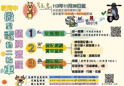 【記者林秀雲/高雄報導】高雄市區監理所表示,依規定微型電動二輪車(含使用中)於113年11月29日前須全面領牌,該所為協助車主儘早完成領牌,於官網設置「微型電動二輪車專區」相關資訊,歡迎車主們善加利用! 高雄市區監理所特別針對有關使用中微型電動二輪車(舊稱電動自行車)領牌事宜,整理注意事項說明如下:1.本(113)年11月29日前應至公路監理機關完成掛牌登記。(領牌流程可詳見宣導圖說)2.道路交通管理處罰條例第71條之1第4項規定,使用中微電車法規修正施行前,已經檢測及型式審驗合格,並黏貼審驗合格標章者,應於實施日後2年內依規定登記、領用、懸掛牌照。逾期(113年11月30日起)未領用者,將依同條例同條第1項第1款規定,處所有人新臺幣1,200元以上3,600元以下罰鍰,並禁止其行駛。3.強制汽車責任保險法已將微電車納保,111年11月30日前已使用之微電車所有人,有2年過渡期,期間內須完成投保並領牌。而微電車投保且領牌後,始納入強制車險承保範圍。投保義務人未投保且未領牌,或已投保未領牌,將不受強制汽車責任保險法保障,倘發生車輛交通事故時,受害人無法向特別補償基金請求補償! 高雄市區監理所進一步表示,微電車領牌納管主要係為保障用路人安全,為道路安全把關,除須投保領牌再上路外,騎乘微電車也請記得配戴安全帽,並不得載人和超速喔!