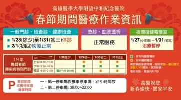 【記者林秀雲/高雄報導】農曆春節假期將至,高雄醫學大學附設中和紀念醫院春節期間,急診、血液透析、住院照常服務;門診及檢查自1/28 (除夕)至1/31 (初三)暫停,2/1 (初四)恢復正常運作;另為兼顧農曆春節期間傳染病病人就醫需求及急重症醫療品質,於1/28(除夕)晚間至1/31(初三)開設傳染病特別門診,如有需求的民眾可上網預約,提醒民眾進入院區建議配戴口罩。高雄醫學大學附設中和紀念醫院各部門春節期間營運調整如下:【門診】、【檢查診】、【健康檢查】■1/28(除夕,星期二)至1/31(初三,星期五)休診 ■2/1(初四,星期六)恢復正常【急診】、【血液透析】春節期間照常。【傳染病特別門診】春節期間預約受理。■1/28(除夕,星期二)至1/31(初三,星期五)高雄醫學大學附設中和紀念醫院關心民眾的健康,並提醒春節期間防範傳染病仍不可鬆懈,尤其南來北往的民眾建議配戴口罩、勤洗手、保持社交距離,外出旅遊注意保暖,平平安安過個好年。